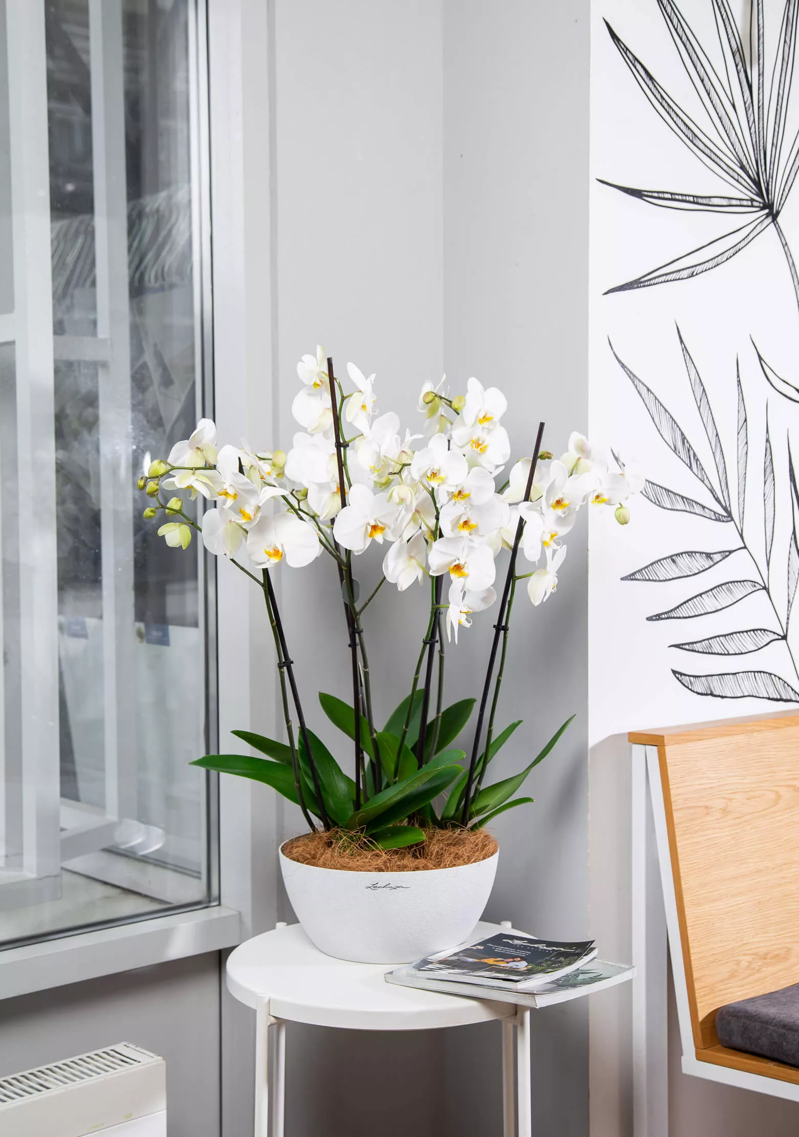 Это беспроигрышный вариант на день рождения или в благодарность. Цветы орхидеи кажутся фарфоровыми — такие же изящные, как и хрупкие. При этом она неприхотлива: любит свет и немного влаги. Отлично смотрится в современном интерьере, на подоконнике, столике или полке.