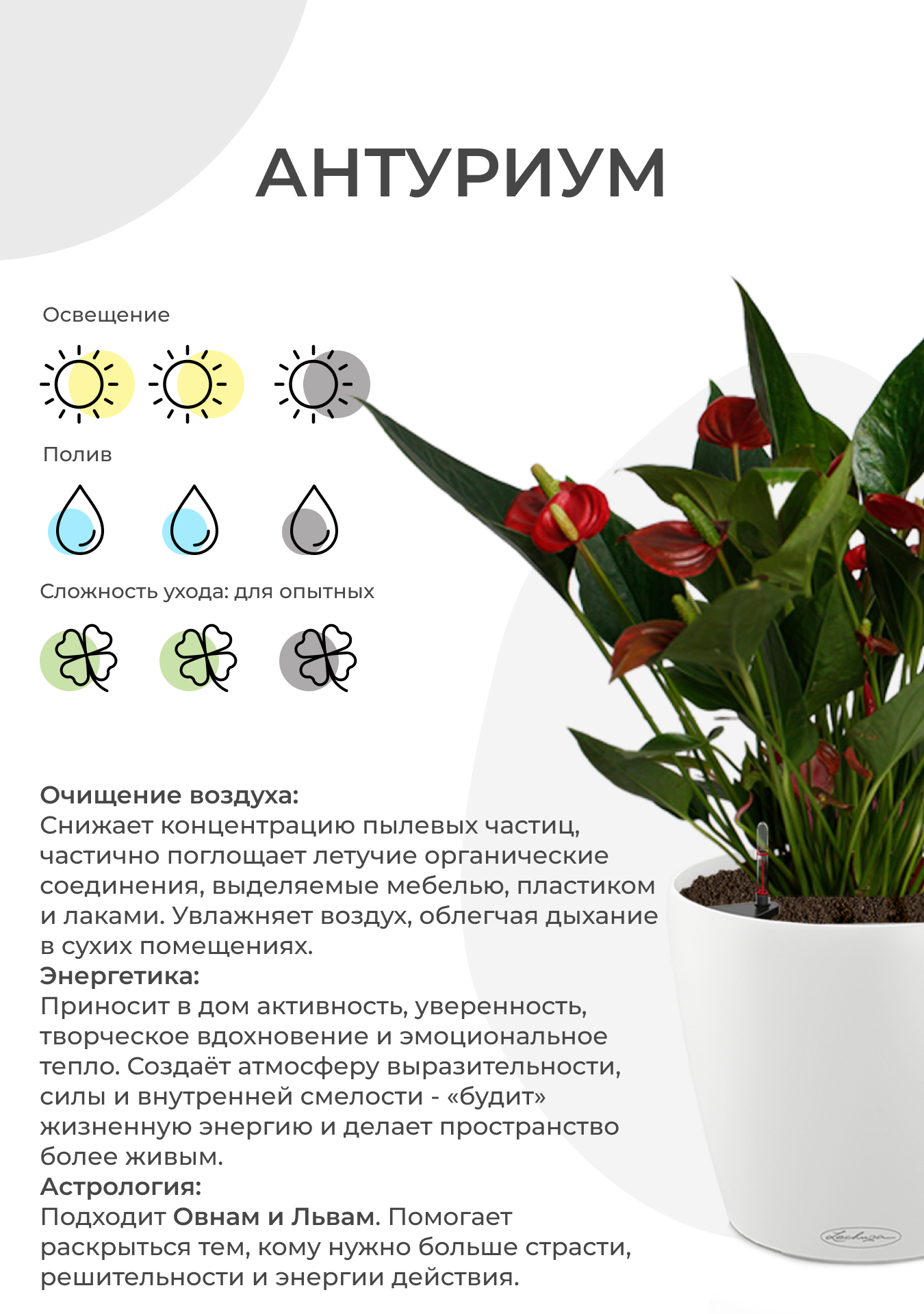 Энергетика: Антуриум обладает сильной положительной энергетикой, которая помогает снять стресс, улучшить настроение и создать уютную атмосферу в доме. Считается, что этот цветок способствует развитию творческих способностей и укрепляет семейные отношения, а также стабилизирует эмоциональный фон своего владельца.