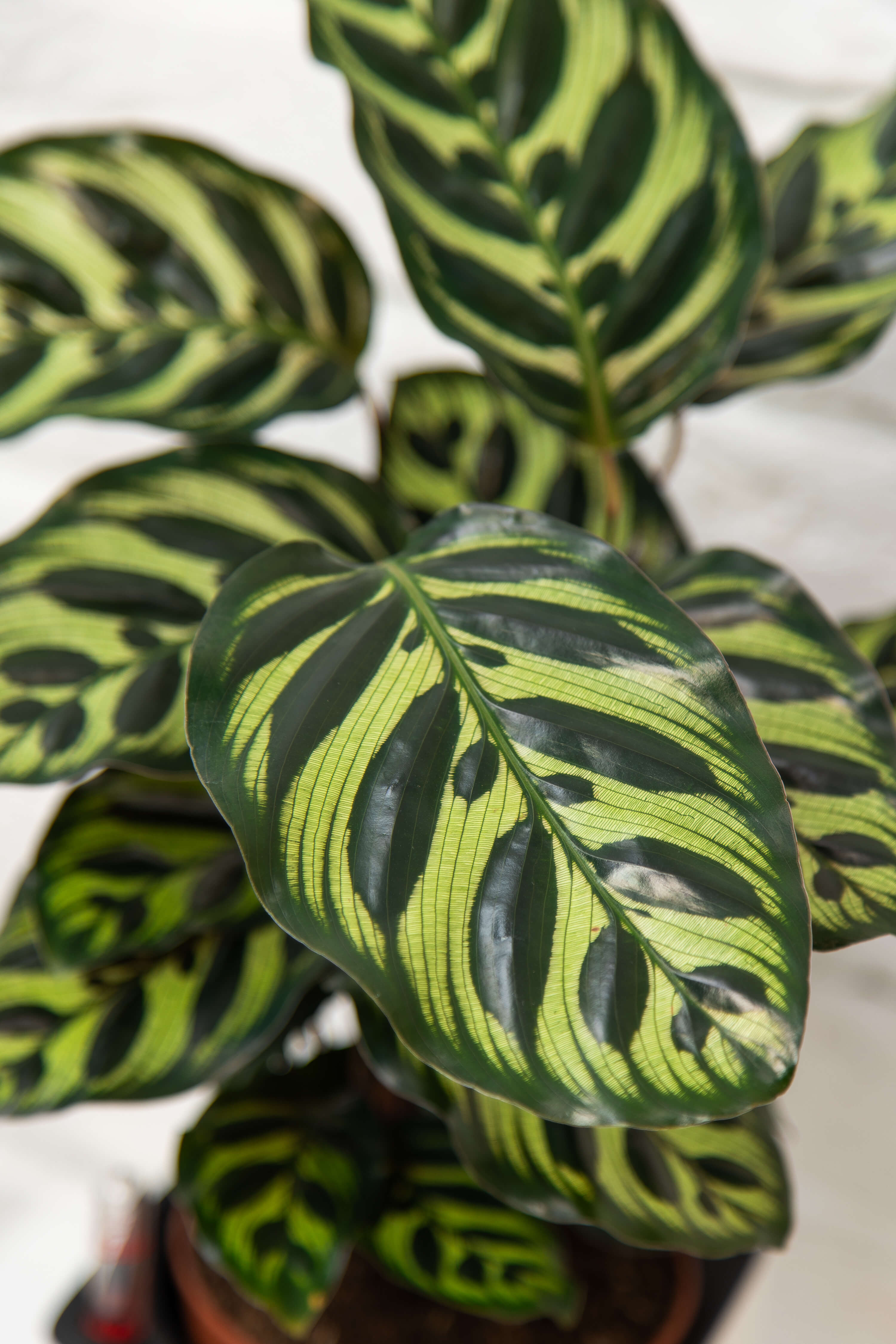 Полив: Поливайте Калатею обильно, но не допускайте застоя воды в горшке. Между поливами дайте верхнему слою почвы слегка подсохнуть. Вода для полива должна быть мягкой, отстоянной и на пару градусов теплее комнатной температуры. Избегайте попадания воды на листья, чтобы предотвратить появление пятен;