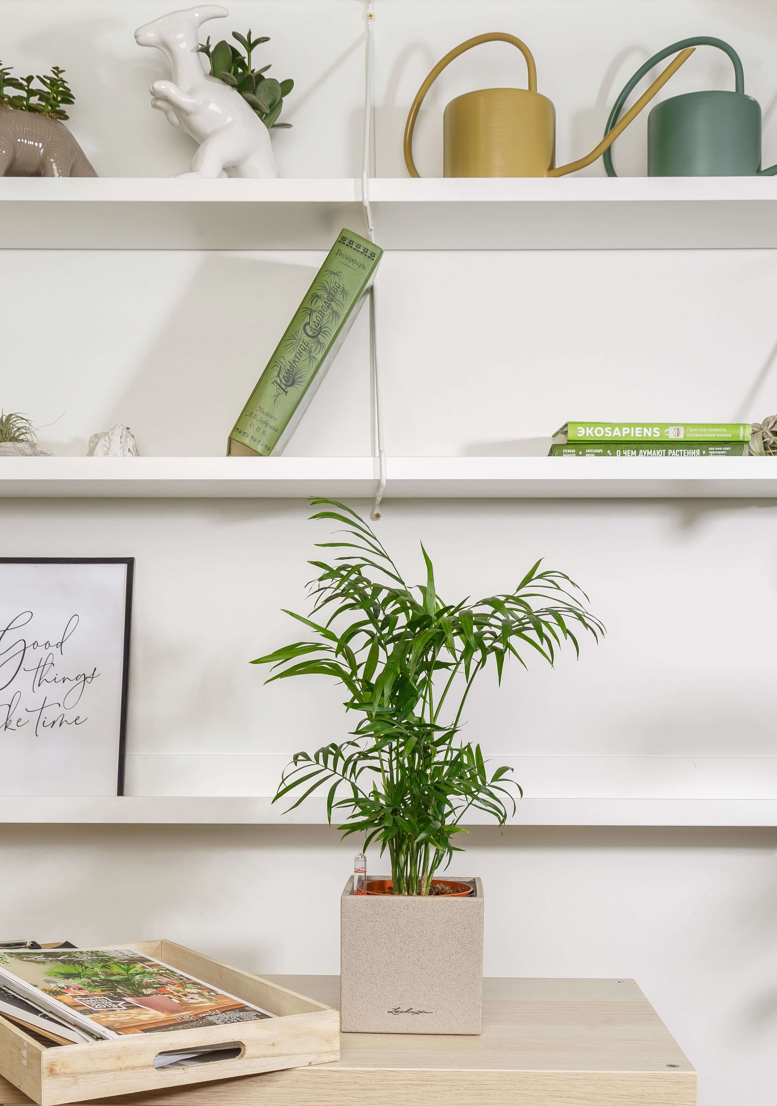 В центре внимания - пальма Хамедорея, самая неприхотливая среди комнатных перистых пальм. Размещая дома красивую раскидистую пальму, многие замечают эффект тропиков, который она создает, словно растение привносит в дом энергию своей родины, позволяет вам очутиться в жарких странах, не покидая порог родного дома. Хамедорея с этой задачей справляется отлично, она расставляет яркие акценты даже в темных интерьерах за счет своей стойкости к недостаточному освещению, а также отличается исключительной засухоустойчивостью. Такое растение вы всегда можете найти и купить в нашем магазине!