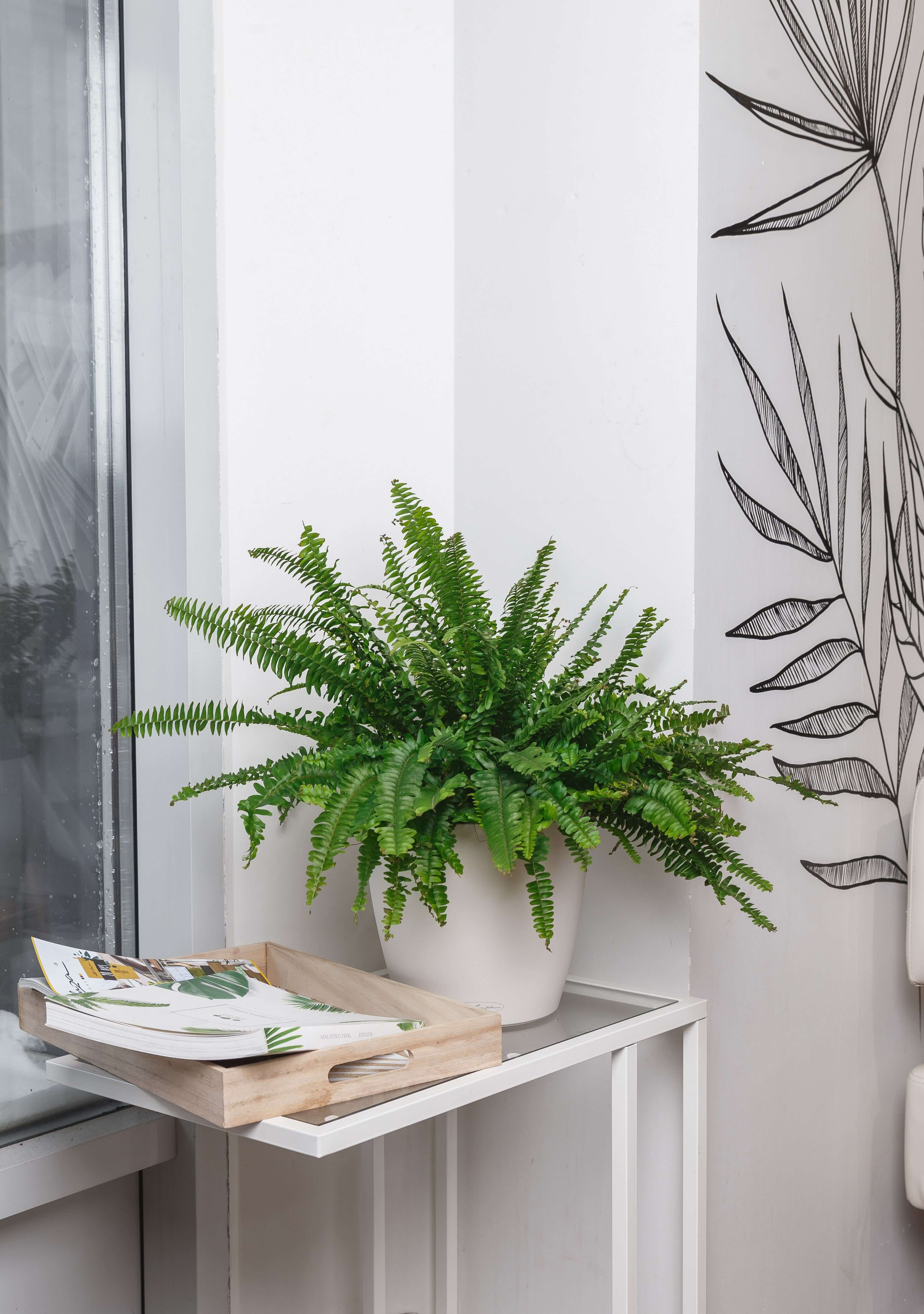 В центре внимания — Нефролепис, также известный как "папоротник живой". Этот папоротник является одним из самых популярных комнатных растений и идеально подходит для украшения большинства интерьеров, благодаря своей воздушной листве и традиционной форме, любимой во все времена. Папоротник отлично освежает внешний вид пространства и является символом надежды и оптимизма.