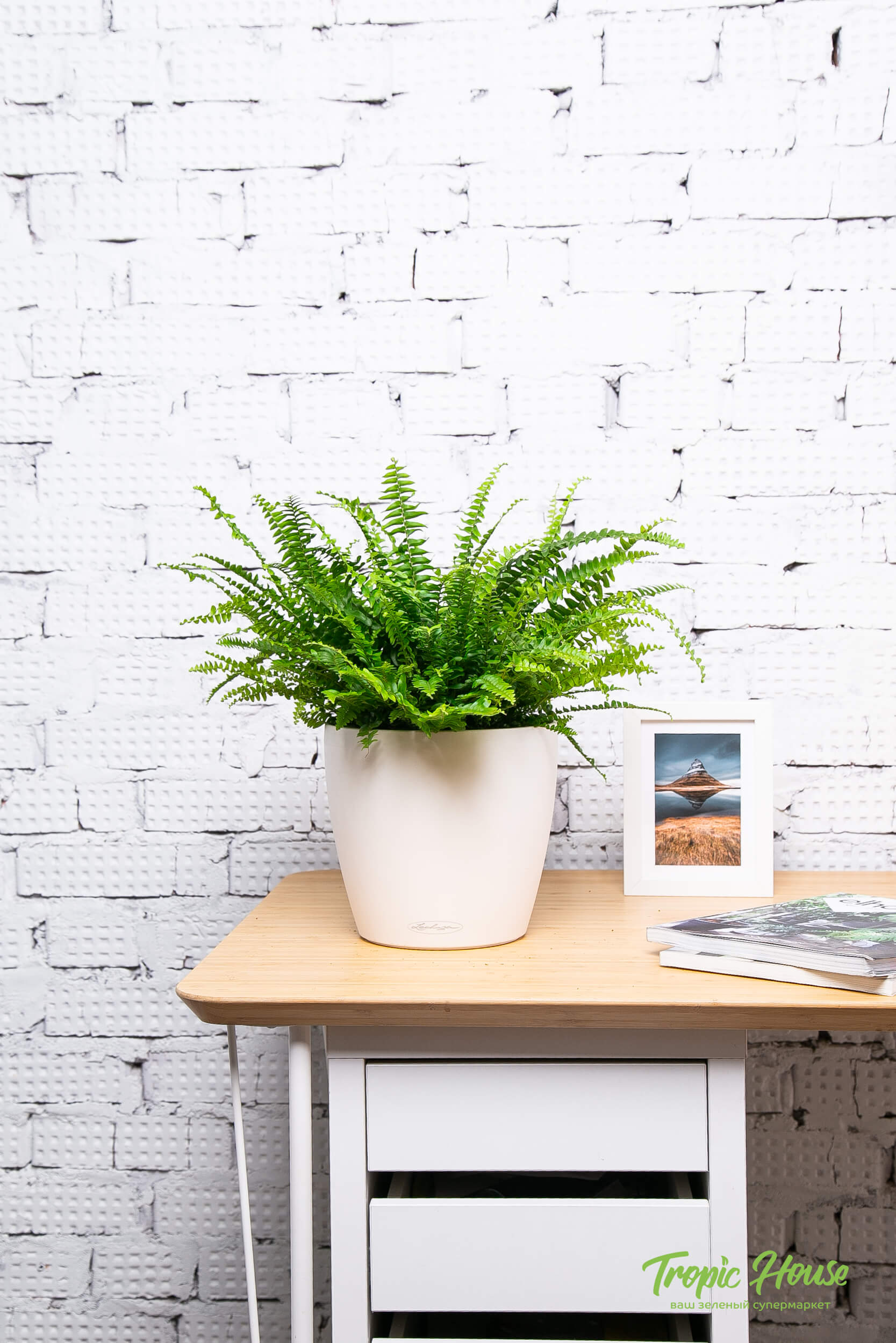 В центре внимания — Нефролепис, также известный как "папоротник живой". Этот папоротник является одним из самых популярных комнатных растений и идеально подходит для украшения большинства интерьеров, благодаря своей воздушной листве и традиционной форме, любимой во все времена. Папоротник отлично освежает внешний вид пространства и является символом надежды и оптимизма.